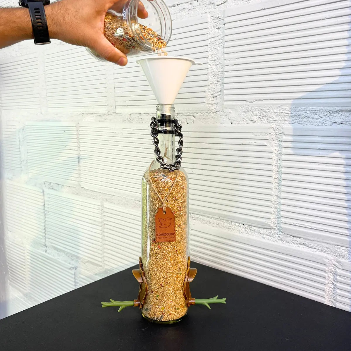 Cada comedouro é feito à mão por artesãos do sul do Brasil, a partir de garrafas reutilizadas que ganham nova vida em forma de beleza e utilidade.