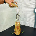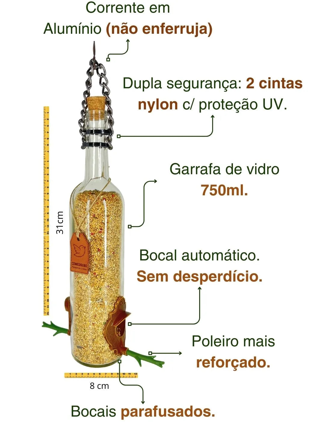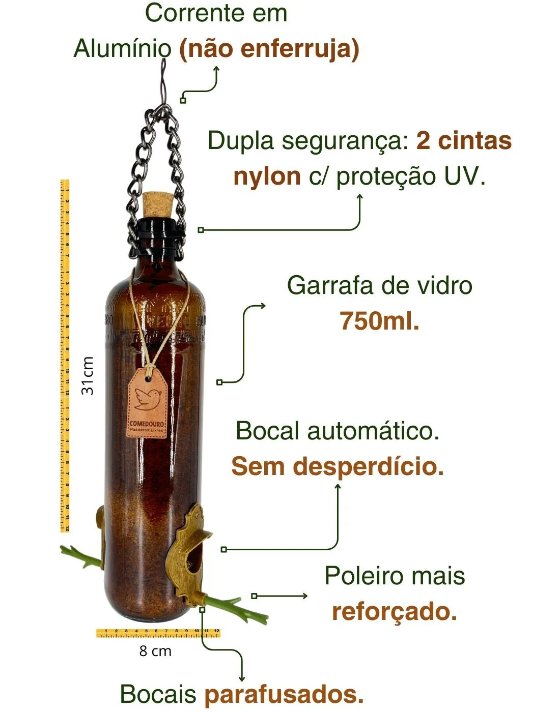 Cada comedouro é feito à mão por artesãos do sul do Brasil, a partir de garrafas reutilizadas que ganham nova vida em forma de beleza e utilidade.